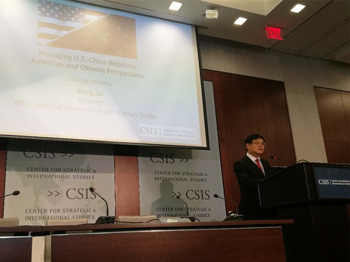 At the invitation of American Center for Strategic and International Studies (CSIS), Wang Jisi, President of the Institute of International and Strategic Studies (IISS), Peking University (PKU) led a delegation to visit the United States from July 5th to 8th, 2017, attending the release conference of the US side’s report under the China-US Think Tank Project hosted by CSIS in Washington. The China-US Think Tank Report has been a major achievement since the China-US Think Tank Project was established one year and a half ago. This project was the first attempt of parallel researches made by the think tanks of the United States and China. It was started to brew by the National Institute for Global strategy (NIGS), Chinese Academy of Social Sciences (CASS) and IISS, PKU from the end of November of 2015 and an intention of joint research with CSIS of the United States was reached in June of 2016. As the first attempt of parallel research by think tanks in the United States and China, this project was led by NIIS, CASS and IISS, PKU in China and CSIS in the United States, respectively. During this process, more than 40 experts and scholars from nearly 20 institutions in the two countries were organized to participate in the joint research. Both sides set up six groups to independently prepare and write the chapters of the reports. The two sides held several seminars in Beijing and Washington and each group also had repeated discussions. The report is divided into six chapters: Overview, Economics, Asia-Pacific, Military, Politics and Global Governance, which are all written by senior experts and young cutting-edge writers in various areas of China-US relations.