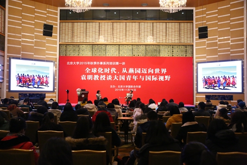Peking University, December 18, 2015: On November 24, PKU Office of International Relations kicked off the Training Sessions of Foreign Affairs of 2015 Fall Semester at the Sunshine Hall in Yingjie Overseas Exchange Center. Yuan Ming, professor from PKU School of International Studies, director of PKU American Studies Center and executive director of the United Nations Foundation, delivered a speech for the first session entitled “Step from Peking University towards the World in the Global Age,” which evoked contemplation on the essence of Chinese youth and international perspective.
