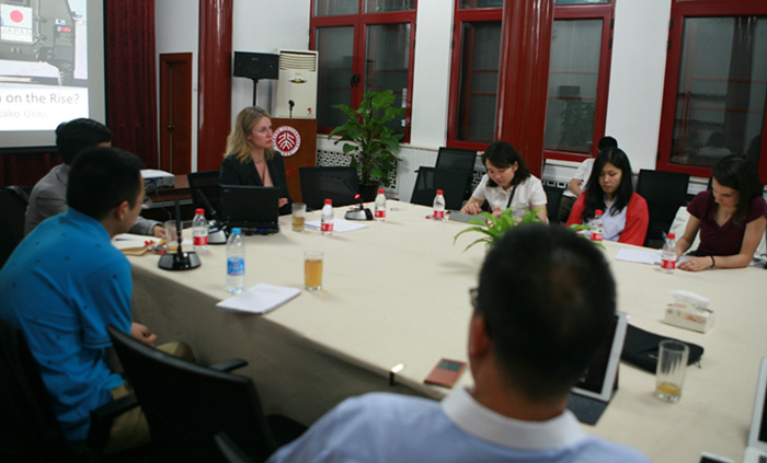 On May 23, 2016, the Institute of International & Strategic Studies (IISS), Peking University (PKU) held a new seminar of the "North Pavilion Seminar", featuring a keynote lecture from Dr. Jennifer Lind, Associate Professor in the Department of Government, Dartmouth College, on the topic of "is nationalism on the rise in Japan". The seminar was hosted by Associate Prof. Gui Yongtao, Assistant President of IISS. Prof. Yu Tiejun, Vice President of IISS, as well as lecturers of the School of International Studies (SIS), PKU, attended the seminar.