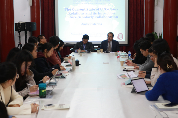 On November 20, 2023, the Institute of International and Strategic Studies (IISS), Peking University (PKU) held the lecture series under the 69th North Pavilion Seminar. Prof. Andrew Mertha, Director of the China Studies Program at the School of Advanced International Studies, Johns Hopkins University delivered a lecture titled "The Current State of China-U.S. Relations and Its Impact on Future Scholar Collaberation." The lecture was chaired by Gui Yongtao, Vice President of IISS and Associate Dean of the School of International Studies (SIS), PKU.