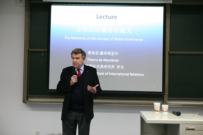 On Dec. 4, 2014, Thierry de Montbrial, President of French Institute of International Relations, attended the "North Pavilion Dialogue" annual meeting at the invitation of the Institute of International & Strategic Studies (IISS), Peking University (PKU), and gave a lecture entitled "the Significance of the Concept of Global Governance" at the School of International Studies (SIS), PKU. Prof. Wang Jisi, President of IISS, PKU, moderated the lecture.