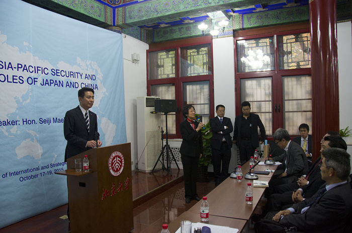 On the afternoon of October 17, 2015, Mr. Seiji Maehara, Former President of the Democratic Party of Japan, Member of House of Representatives and Former Minister of Foreign Affairs of Japan attended the second “North Pavilion Dialogue” held by the Institute of International and Strategic Studies (IISS), Peking University (PKU) on invitation and delivered a lecture on Safety and Security of the Asia Pacific Region and the Respective Roles of China and Japan. The speech was hosted by Prof. Yuan Ming, Assistant President of IISS, PKU. Nearly a hundred students of PKU and external experts and scholars attended the event.